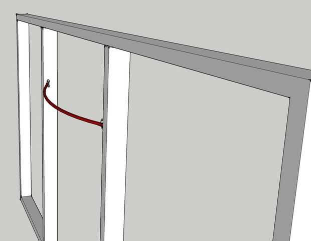 Ahora la curva el alambre colgante (coloreada rojo) fuera de su marco como en el diagrama (Foto 1). Pídale a un amigo para ayudarle y levante con cuidado la pantalla a la altura del gancho de colgar. Baje con cuidado el alambre curvado que cuelga en el gancho de colgar y lentamente deje que la pantalla de en el gancho. Porque la pantalla es pesada el cable colgante puede establecerse un poco.