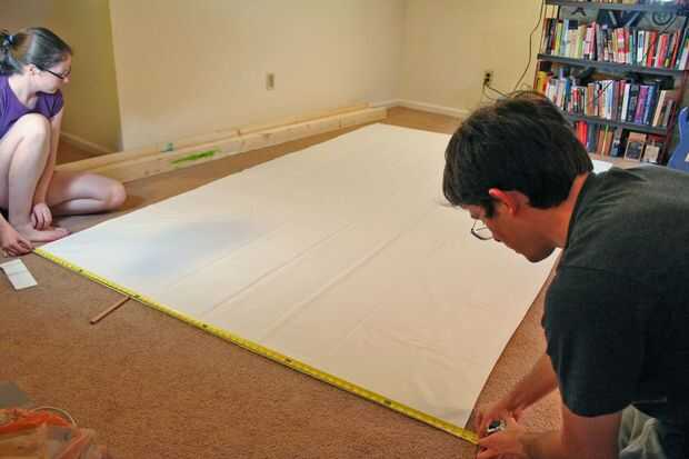 Vamos a construir un marco de 2x4s (que son realmente 1.5x3.5), y queremos que el paño para envolver todo el camino alrededor del borde de la 2 x 4. Eso significa que necesitamos nuestro marco para tener un mínimo de 7 pulgadas menos ancho y largo que la tela. Para estar en el lado seguro, decidimos construir nuestro marco 100 x 56.