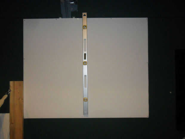 Colgantes nivel fue un juego de niños a solas, aunque no vendría mal un par de manos extra. Utilice tornillos plateados y mantenerlos dentro de una pulgada o tan de la orilla por lo que puede ser cubiertos con un borde si usa uno y no destacan mucho si no lo hace. Apenas los veo cuando la habitación es oscura y el proyector is...well, proyectar.
