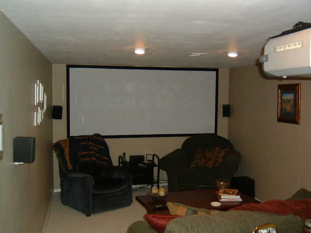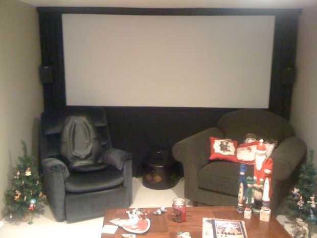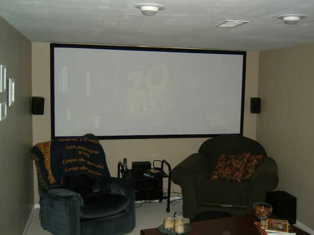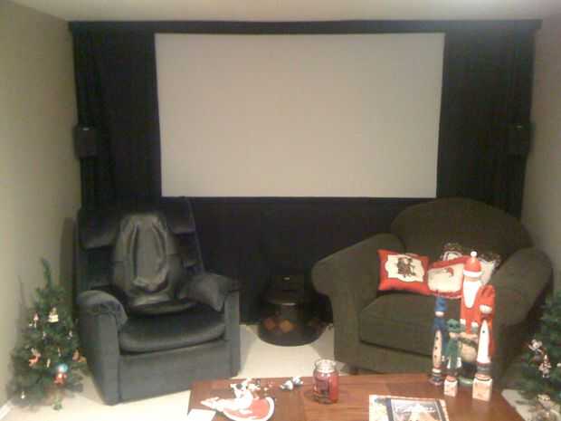 ** Nota sobre la relación de aspecto: para obtener las medidas para mi pantalla, elegí una película con la relación de aspecto de 2.35: 1 (películas como Matrix, Starwars, etc.) y sopló la imagen hasta el tamaño que quería. Cuando veo contenido con 16 x 9 ó 4 x 3, hay blanco en ambos lados de la pantalla no se usa. Para solucionar esto, he añadido cortinas negras (junto con una falda negra) para que cubra cualquier parte no utilizada de la pantalla (ver fotos abajo). El resultado es que la pared entera la película o el negro. Otra forma de abordar la variación de la relación de aspecto sería crear una pantalla de 4 x 3 que era mucho más alta, pero todavía tan amplia como sea posible. Entonces, podría tener una falda negra que subes contenido o contenido de 2.35: 1 16 x 9. Esta manera, independientemente de la relación de aspecto, su contenido será tan amplia como sea posible en la pared.