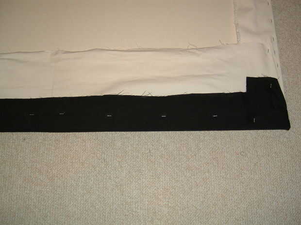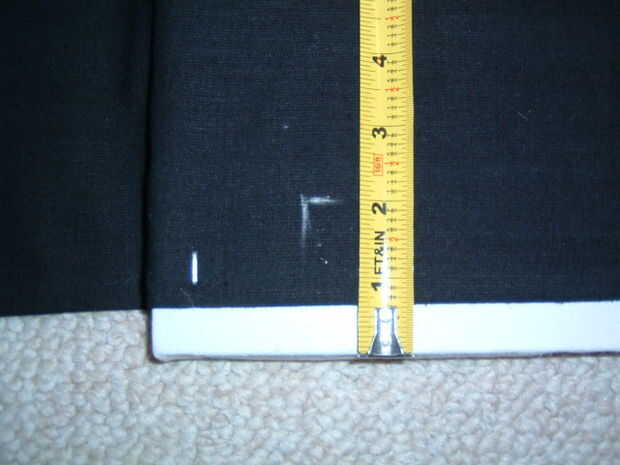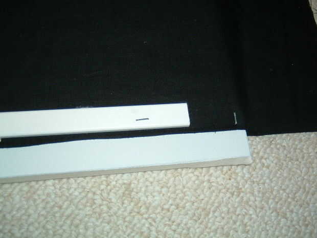 Empezar el mismo proceso para la longitud (en última instancia, la parte superior e inferior de la pantalla). La única diferencia es que esta vez, cortar la moldura para ir todo el camino a cada borde (cada lado). Está bien si usted tiene que utilizar más de una pieza de ajuste de longitud ya que es de todos vamos a conseguir cubiertos para arriba por el material negro de todos modos. La última foto en este paso ilustra esto como se verá una vez que el material es con grapas y colocar la moldura, pero todavía tienen que envolver a la parte posterior.
