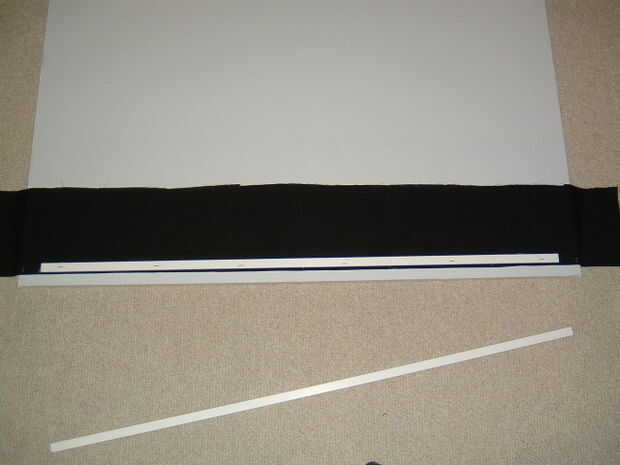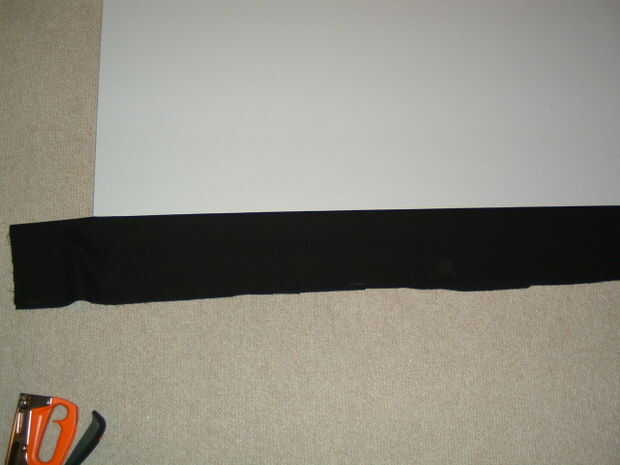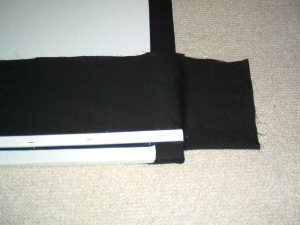 A continuación, voltear la pantalla de modo que el dorso quede mirando hacia arriba, luego envolver el material negro alrededor de la parte posterior. Hacerlo, usted es envolviéndolo sobre 1" ajuste, cubriéndolo para arriba. Asegúrese de que el material esté tenso.