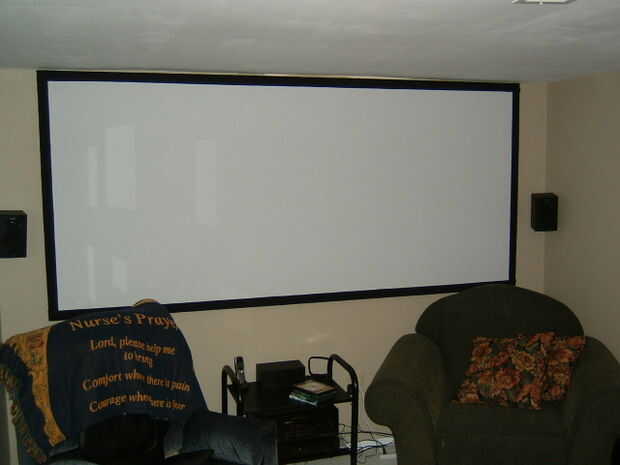 En el techo, usé tornillos con ganchos abiertos. Hice los agujeros y utilizar tarugos para darle suficiente fuerza para levantar la pantalla (confía en mí, si no está atornillado en los pernos prisioneros, necesita tarugos). Recuerde, si usted está colgada cerca del techo, necesita suficiente espacio de maniobra para tenerlo enganchado y zafado.