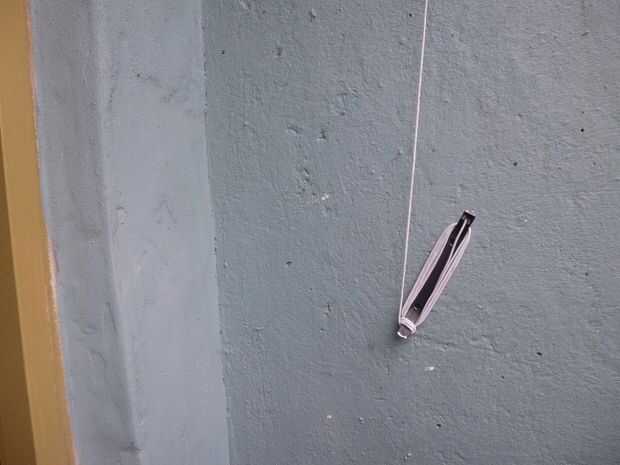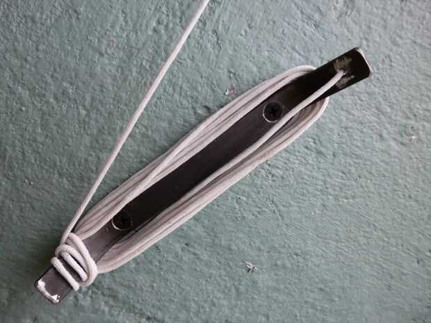 tomé un trozo de unos 15 barra de cm 1/8" por 1/2", hice un agujero de 5 mm en un extremo y dos en unos 5 cm de cada extremo. Dobla estos 30 grados y atornilla la barra a la pared, hasta la mitad en el rodillo carrete.