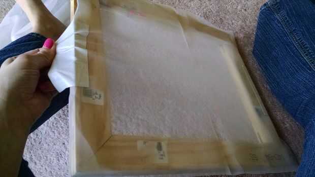 Empezar en medio de uno de los lados más cortos del marco. Poner un trozo de cinta de la malla y fijar a la estructura para que la cinta se envuelva alrededor a la parte posterior sin estirar. Gire a la cinta lateral y lugar opuesta en el centro y tire de la malla y la cinta lo mas ajustado posible y pegue la cinta.