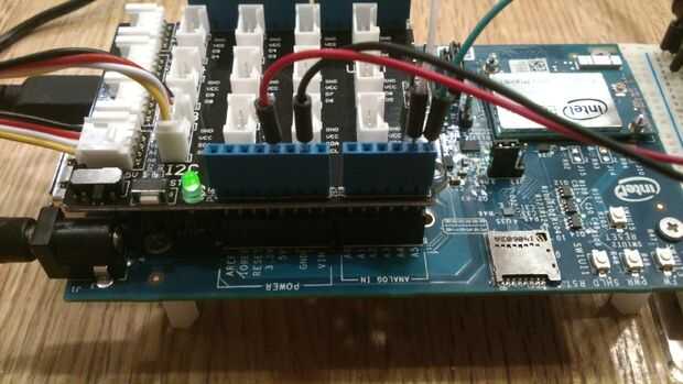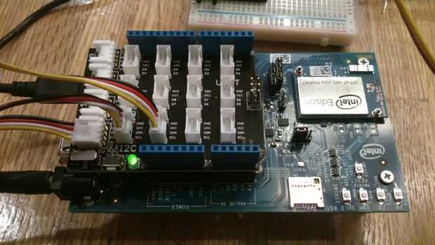 Tienes una opción con el cableado del I2C. Puede tomar los puentes para ambos dispositivos, o pueden enchufe un cable de grove en el Edison y hacer lo mismo como lo hizo con el cable del botón.