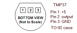 El TMP37 está diseñado para aplicaciones en el rango de 5 grados C a 100 grados C y proporciona un factor de escala de salida de 20 mV por grados C. El TMP37 proporciona una salida de mV 500 a 25 grados C. operación se extiende a 150 grados C con exactitud reducida para todos los dispositivos cuando operan desde una fuente V 5. La impedancia de salida baja de TMP35/TMP36/TMP37, su salida lineal y una calibración precisa simplifican la conexión a circuitos de control de temperatura y ADCs. Los tres dispositivos están diseñados para operación de suministro de solo 2,7 V a 5.5 V máximo. En mi prueba debe utilizarse una fuente de + 5 voltios estable!
