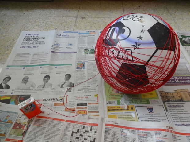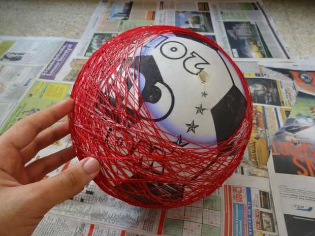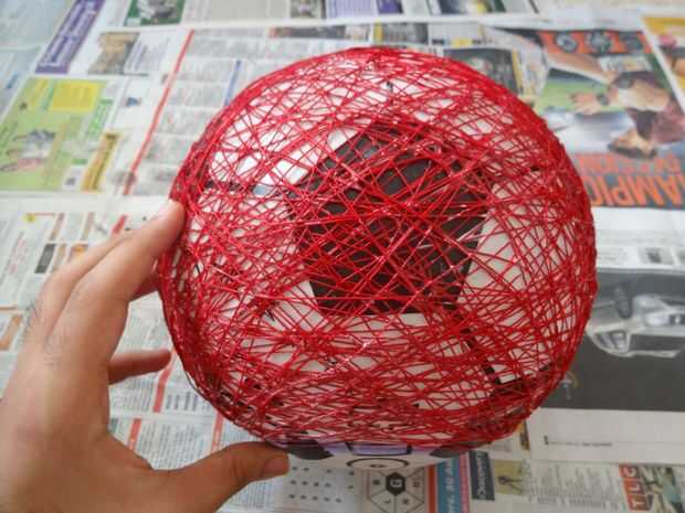 Viento la pelota con el hilo húmedo cubierto de pegamento y asegúrese de que el devanado está apretado y no se enrolle el hilo sobre el círculo que se marcó en la bola. Hacer bucles sobre la circunferencia más ancha de la bola. Tratar de enrollar el hilo sobre todas las partes de la bola sin dejar ningún vacíos parches.