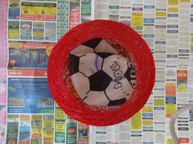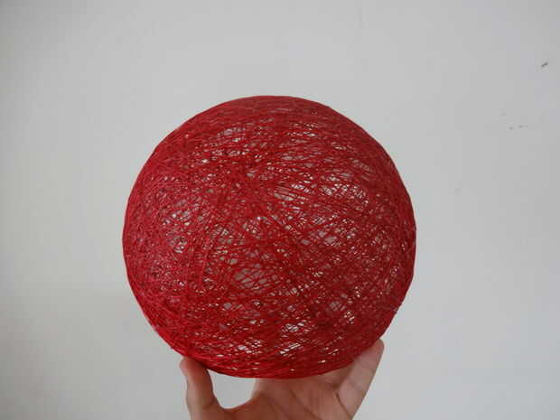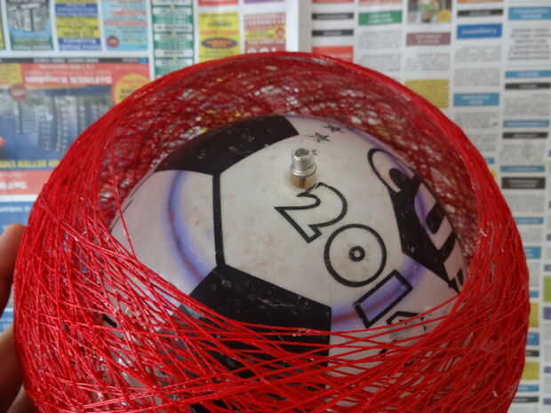 Después de que las bobinas de hilo completamente seco y endurecido por, lentamente desinfle el balón. Ya que la pelota es de goma fina, debe separarse fácilmente de la rosca y el pegamento. Asegúrese de manejar con cuidado para no alterar la forma.