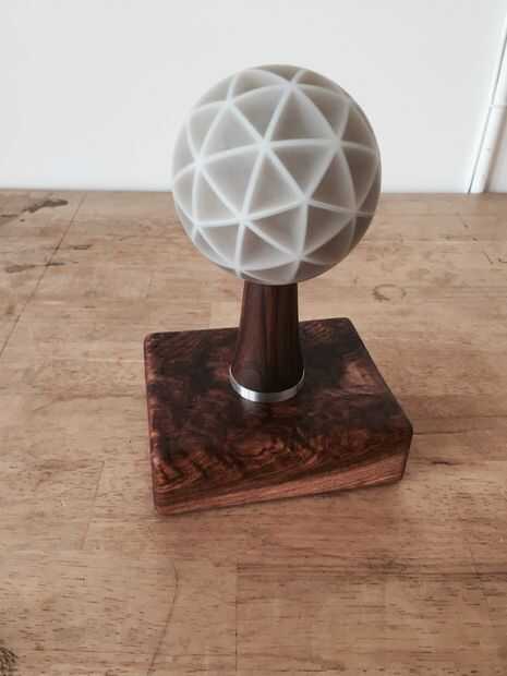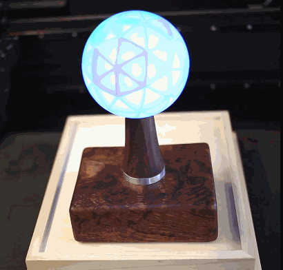 Este es el plato fuerte de mi residencia de artista en el muelle 9: una interactiva pantalla LED esférica con 76 facetas iluminadas sensibles al tacto. Detectores infrarrojos en cada faceta reaccionan para tocar y facilitar la interacción táctil.