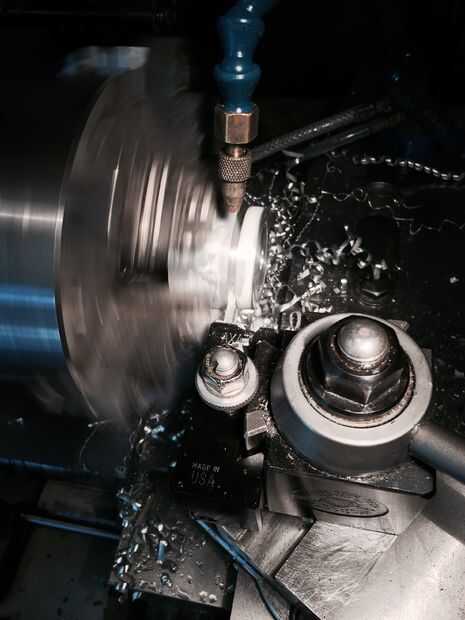 Quería una separación entre los diferentes bosques de la canalización vertical de nogal y el eucalipto base, así que había fabricado a un espaciador de aluminio. Usando un torno era fácil hacer un aro del diámetro exterior exacto de la canalización vertical con un centro 3/8 agujero para el tubo roscado. Usé autofeed en la pasada de corte final para un acabado uniforme de ranuras finas.