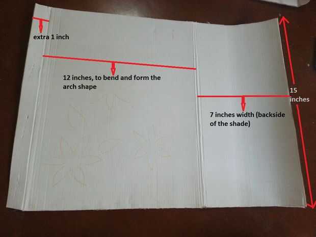 La pantalla que he hecho es en forma de arco, 15 pulgadas de alto y 7 pulgadas de ancho. Tuve que cortar un trozo de cartulina de 15 X 20 pulgadas y 12 pulgadas de la curva en forma de arco. Asegúrese de mantener una pulgada extra mientras se reduce la anchura porque te tienes que pegar y unirse a los lados.