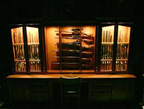 Planificación: La idea era brillo LED de alta potencia solo hacia abajo a través de cada sección del gabinete también destacar la colección de armas de fuego! Para la estética, se utilizó una sierra para que sólo la lente del LED se puede ver desde dentro del gabinete; el disipador de calor y fuente de alimentación están ocultos en la parte superior. También, se incluye en la parte superior del gabinete es una gire la perilla de regulación - los LEDs son tan brillantes que yo personalmente prefiero funcione alrededor de la mitad de la energía.