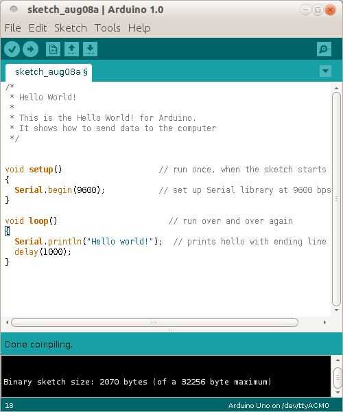/* * Hello World! * * This is the Hello World! for Arduino. * It shows how to send data to the computer */voidsetup() // run once, when the sketch starts { Serial.begin(9600); // set up Serial library at 9600 bps } voidloop() // run over and over again { Serial.println("Hello world!"); // prints hello with ending line break delay(1000); } [/ code]