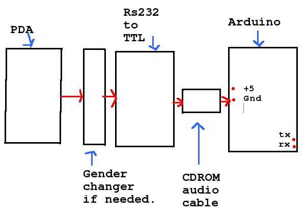 PDA y cable serial >> cambiador de género si es necesario >> rs232tottl adaptador >> cable audio de CD-ROM >> corregir puntos en el Arduino. (rx, tx, + 5 y la tierra.)
