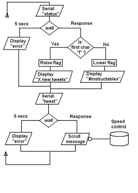 Initialise LCD Set up constants Create buffer for incoming messages Set up the LCD as 16x2 characters, no autoscroll Display "Zeitgeistometer!\n (c) PKM 2010" on the display Set up the servo and its control pin Turn on the servo, move the servo to the "down" position and turn off again loop: Note the time when starting the loop Write "status\n" to the serial link Await a message on the serial link or for ten seconds to elapse If a new message arrived: Wait to receive entire message Read the message into a buffer Read the first char of the message If the first character is 'T' Set "new tweet" flag Active the servo, raise and deactivate Print the contents of the message to the bottom row of the display Else If the new tweet flag is set Clear the new tweet flag Active the servo, lower and deactivate print "#instructables" to the bottom row of the display Else Print "No status message" to the display Wait 0.5 seconds Write "tweet\n" to the serial link Await a message on the serial link or for eight seconds to elapse If a new message arrived: Wait to receive entire message Read the message into a buffer Set the current position to character 0 While the character 15 characters beyond the current position is not a null Read the speed control Map [0-1023] to a delay in the range [50-550]ms, wait for that interval Display the 16 characters from the current position on the top row of the LCD Increment the current position Else Print "No twit response" to the display Function clear_buffer: Write 150 null characters to the message buffer Function read_to_buffer: clear_buffer() while characters are available from the serial link read a character from Serial to the message buffer