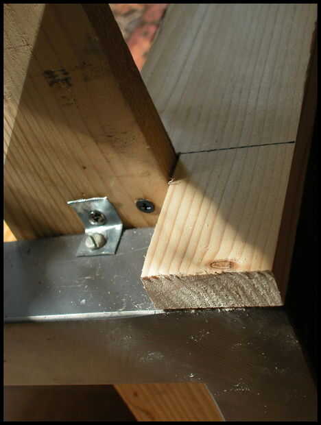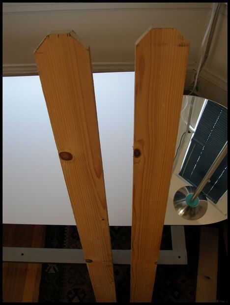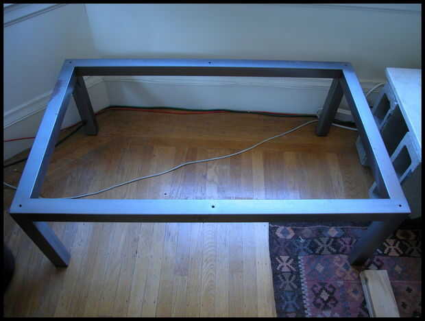 Último pero no menos importante, construir alguna estructura para apoyar la pantalla. Empecé desde un marco de mesa de café como una base y unos tablones de madera para conseguir la pantalla para arriba en el aire. La geometría exacta depende de la óptica de su proyector. Que tomé prestado no se centran en distancias cercanas por lo que fue necesario que la luz sigue un camino más largo, rebotando en el espejo y de vuelta para arriba en la pantalla. El ángulo de la superficie de la pantalla coincide con el del proyector (ángulo de incidencia = ángulo de reflexión) con el fin de reducir al mínimo la distorsión trapezoidal.