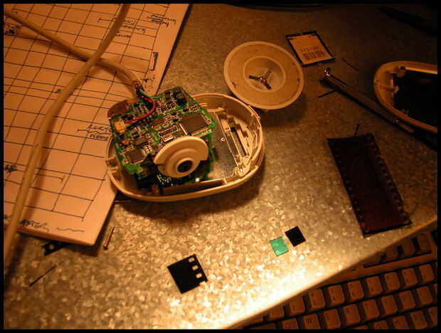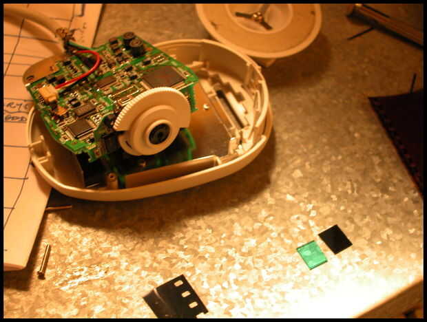 Para la imagen la luz infrarroja, necesitamos una cámara de infrarrojos. Afortunadamente CCD en cámaras de consumo baratos es bastante sensible a IR, tan sensible en realidad que es necesario filtrar el ir para conseguir buenas fotos. Tengo suerte y tenía una webcam intel vieja mentira aroud que fue un juego de niños para quitar el filtro ir. Reemplace el filtro de infrarrojos con filtro de luz visible (por lo que la cámara no ve la pantalla proyectada). He utilizado el extremo expuesto de un negativo. Véase por ejemplo, este instructable para más detalles.