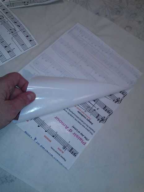 Rasgón de páginas de libro de música. Fusible de corte cinta 1/2" más pequeño que la página. Coloque la página de partituras en planchar, reverso hacia arriba. Coloque la cinta fusible sobre partituras, lado de papel hacia arriba. Hierro. Recortar el diseño o simplemente recortar bordes. Pele el papel de la parte posterior de la cinta fusible.