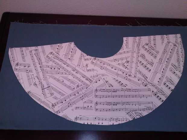 Coloque cada pieza de música de la hoja encima de muselina y presionar con la plancha caliente. Añadir más música de la hoja y asegúrese de que toda la tela dentro de la línea de trazo se cubre con música de la hoja. Se superponen y colocar papeles en diferentes ángulos. Al llegar toda la zona cubierta, gire y corte en la línea de trazo.