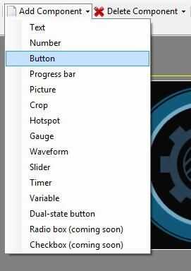 En la pestaña "Agregar componente" seleccionar la opción "botton" y aparecerá un recuadro gris es el área donde se accionará el botón la cual es ajustable lo recomendado es hacerla del tamaño de la imagen del botón para se activa en cualquier área donde se presione