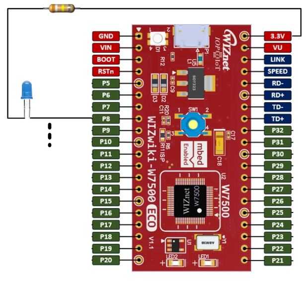Cuadro muestra cómo conectar un LED solo y WIZwiki-W7500ECO.
