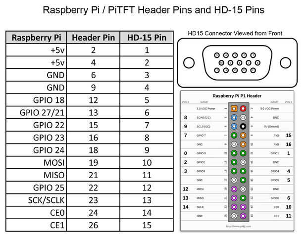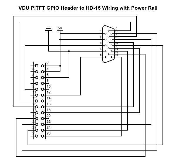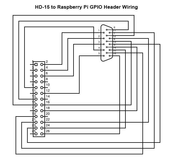 - Los terminales están cableados directamente desde la cabecera GPIO para el de conector HD-15 (véase la nota a continuación sobre alimentar el Pi a través de los pasadores GPIO header)