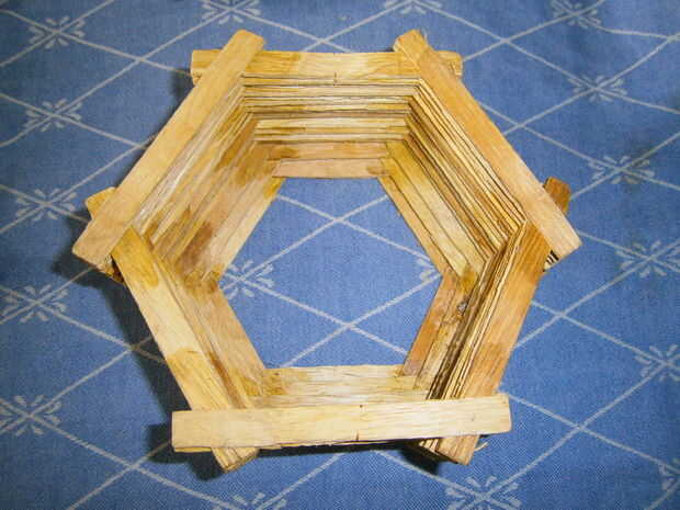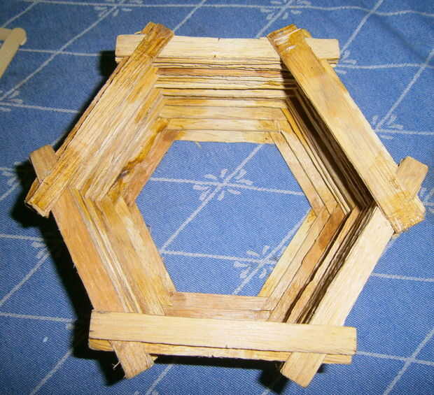 Después de mover el pegamento hacia afuera los palillos moviendo verticalmente hacia arriba. Las barras de pegamento siguiendo el patrón del hexágono en secuencia. Esto formará la altura de la lámpara.