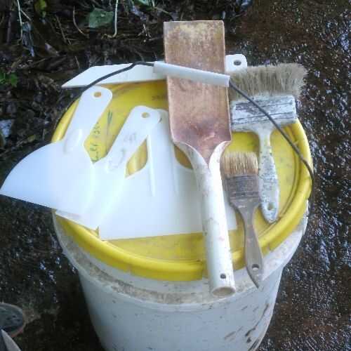 Usted necesita guantes de goma, un cepillo de casa y un recipiente de mezcla. Una llana pequeña también es a veces útil. Una esponja mojada ayuda para limpieza de manchas.