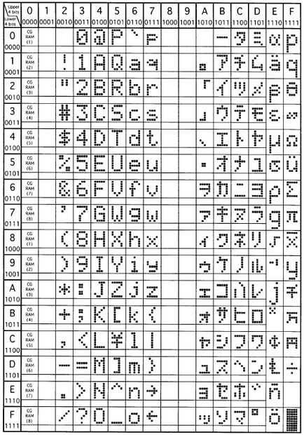 Pulsa el botón rojo grande! Bueno, no realmente, pero se puede imaginar. Empuje el interruptor momentáneo. Hey, hay un cursor, ahora quiero algunas letras. Bueno, eso es fácil. interruptor de registro seleccionar en modo de caracteres (el interruptor está apagado). Ahora enviará la letra A en capital. El código para el capital (A) es 01000001. Mueva los jumpers en consecuencia y presione el botón. Bueno, ahora hay una carta una. Un gráfico completo de letras y símbolos está por debajo. Jugar un poco. Los bits superiores son los izquierda 4 puentes y los bits inferiores son el derecho 4. Cuando se rellena hasta pantalla, necesita aclarar. Para ello, cambie el medidor al modo de comandos y escriba 00000001. Este es el comando clear. no olvides presionar el botón. Así que ahora tienes un controlador simple para abroader conocimiento de LCDs y pantallas LCD. En el futuro, puede ad una actualización en la fabricación de caracteres personalizados, pero eso es todo por ahora. Espero que esto ayudó!