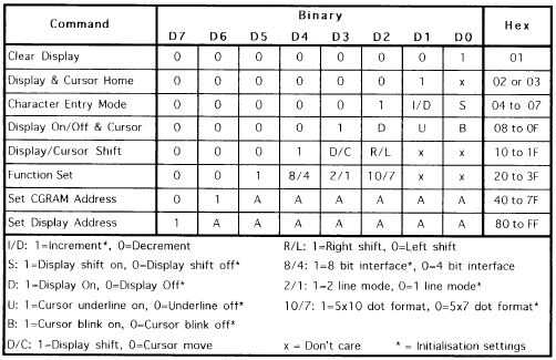 Como ya he mencionado en el paso uno, LCDs utilizan un código ASCII de 8 bits. Para usar este probador, primero Conecte el LCD y luego el poder. Oh no se de roto! Hay un montón de cuadrados negros! No te asustes. Ésos Plaza se supone que son, eso significa que es. Los cuadrados (rectángulos técnicamente pero bueno) significa que la pantalla LCD está encendido pero no todavía activado. Para activarlo que debemos enviar una señal que indica la pantalla de LCD para activar, dar un cursor y parpadear para la buena medida. ¿Cómo lo hacemos? Fácil. Primer conjunto el registro selector en modo comando (el interruptor está encendido / lógica 1). Esto es para que la pantalla LCD sepa que estamos enviando un comando y no una letra (modo de carácter). Ahora en la línea de los puentes, cualquier puente quitado representa un 1, y ningún jumper conectado representa un 0. El código para lo se ha descrito anteriormente es 00001111 (es una lista completa de comandos a continuación). Para que los primeros 4 puentes deben ser conectados. y los 4 últimos. No pasó nada. No debería haber sucedido. Todavía debe tener cuadrados negros. Ahora tienes que decirle a la LCD para aceptar el comando. así que...