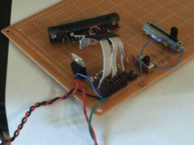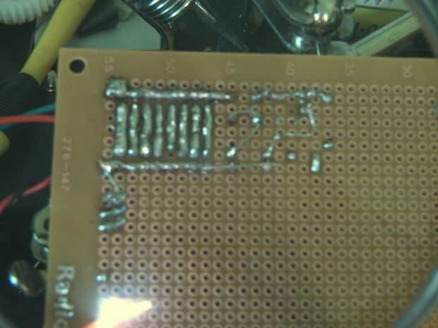 Ya que mi LCD está conectado a un conector macho de puerto paralelo, tuve que conectar mi cable de cinta a un conector de puerto paralelo hembra. Si va a cablear directamente a la pantalla LCD, pin 14 se conectará al primer puente y pin 3 el contraste. Pin 1 y 2 se conectará al poder. mirar el esquema para los detalles. Lo que hicimos todo al revés (si nos fijamos en la ubicación del pin le pantalla LCD que es generalmente el eje izquierdo) era para que cuando nos envía señales, les estamos haciendo la forma correcta de alrededor. PIN 7-14 en la pantalla son realmente lo que es al revés. Si quieres conectar tu LCD al puerto paralelo, tienes que seguir el siguiente esquema para este. El esquema es una vista trasera de un conector de puerto paralelo macho. Las conexiones del analizador a la mujer del puerto paralela es una imagen de espejo. De cualquier manera usted conecte a su LCD, esta parte es necesaria. Que el espacio entre las resistencias y los interruptores de puentes es donde conectas el cable de cinta. PIN 14-7 conecta los espacios puente, Pin 6 al espacio interruptor momentáneo y pin 4 al espacio interruptor SPST. Pin 5 está conectado a tierra, y el pin 3 está conectado al pin de slider del potenciómetro. IMPORTANTE: Los espacio debe ser rellenado! los interruptores de puentes y según cinta cable cables y resistencias debe estar conectado como uno.