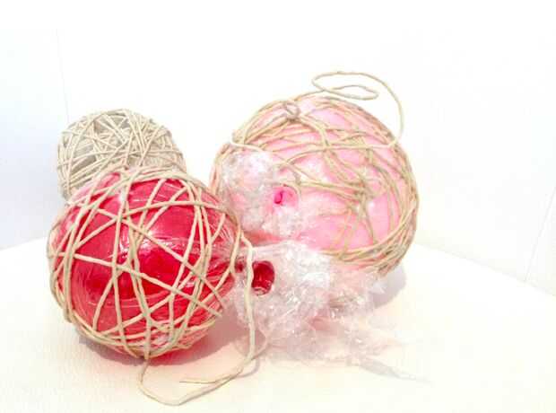 Enrolle la cuerda alrededor de cada globo y sobre la envoltura de plástico. (No te preocupes acerca de limpieza de los extremos, puede recortarlo después del secado).