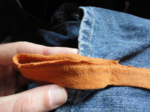 he dejado aproximadamente 2 pulgadas, que en retrospectiva sólo debe ser aproximadamente una pulgada si tu usando el material de la camiseta. Una manera fácil de medir 2 pulgadas es mediante los pliegues en el dedo.