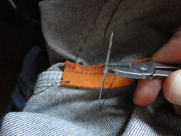 Tener un par de pinzas es muy útil para perforar a través del dril de algodón y el proceso de costura si es bastante sencillo. Corte una longitud de hilo a tu gusto, luego lazo aunque el ojo de la aguja y coser lejos. Aunque quiere asegurarse de mantener cerca el área donde la tela del pantalón se unieron por lo que costumbre ser tan sensible. También no quiere ir por la borda, que unos buenos puntos a hacer bien.