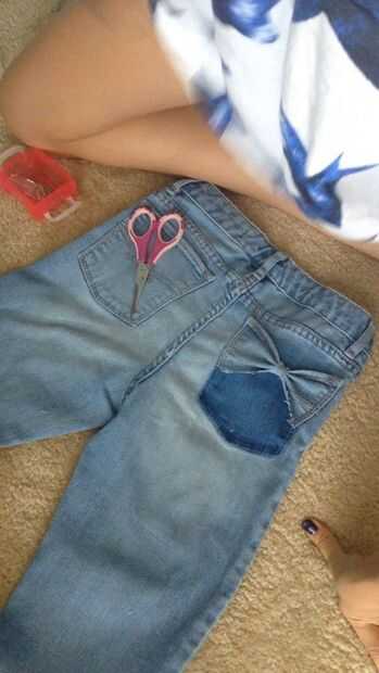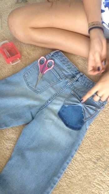 insumos necesarios: tijeras, lápiz, pantalones vaqueros de la tienda de segunda mano, paja, blanqueador, bedazzler, lavadora, espárragos, hierro-en remiendo y hierro.1) marcan los jeans a la longitud que desee cortar.2) cortar los jeans en donde se l