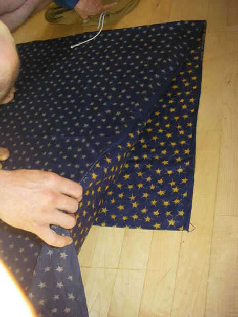 Obtener alguna tela elegante para tus shorts. Roban algunas cortinas o golpear un animal en la carretera con su coche y broncear su piel. Coloque en el suelo y plegar como se ve aquí así que usted puede cortar dos trozos de tela al mismo tiempo. Accidentalmente no hará dos patas izquierdas de esta manera.