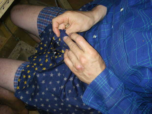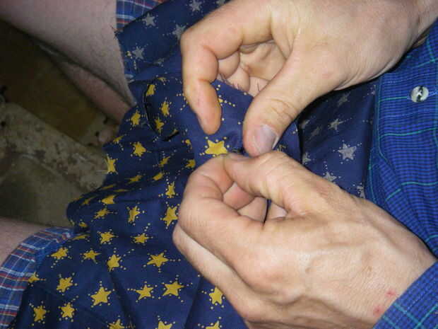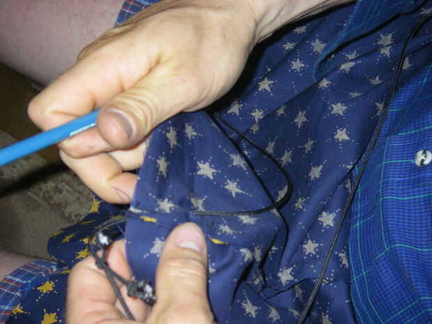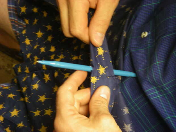 Puedes coser los pantalones primero e instalar más tarde el lazo, pero es más fácil coser la tela alrededor de él.