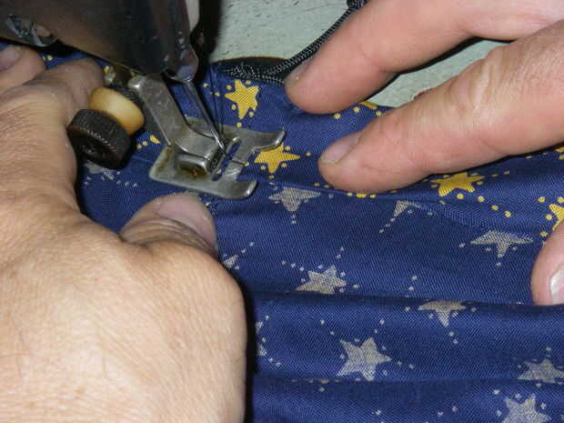 Meter los dos extremos de los cordones por los agujeros y dobla el paño en el lazo. Doblar otra vez así que el no es expuesto el borde del extremo cortado de la tela. Coser el dobladillo. No coser a través del lazo. Realmente quiera virar el lazo en un solo lugar en la parte trasera por lo que no sale en la lavadora.