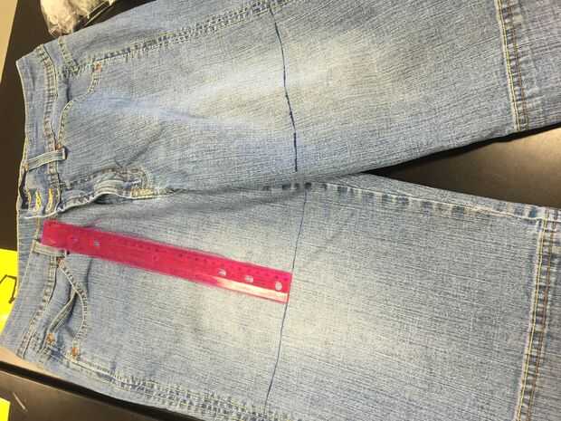 insumos necesarios: tijeras, lápiz, pantalones vaqueros de la tienda de segunda mano, paja, blanqueador, bedazzler, lavadora, espárragos, hierro-en remiendo y hierro.1) marcan los jeans a la longitud que desee cortar.2) cortar los jeans en donde se l