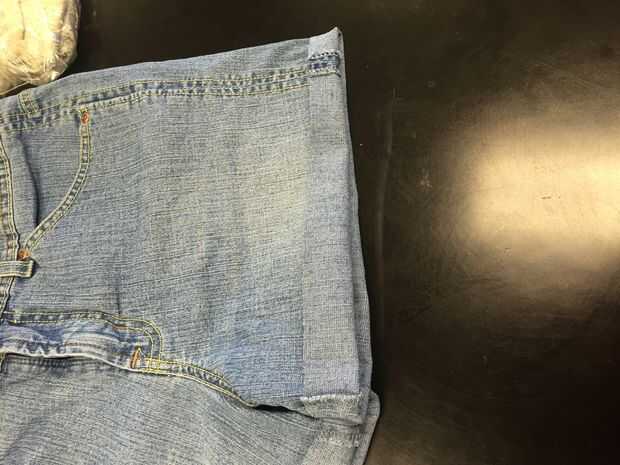 insumos necesarios: tijeras, lápiz, pantalones vaqueros de la tienda de segunda mano, paja, blanqueador, bedazzler, lavadora, espárragos, hierro-en remiendo y hierro.1) marcan los jeans a la longitud que desee cortar.2) cortar los jeans en donde se l