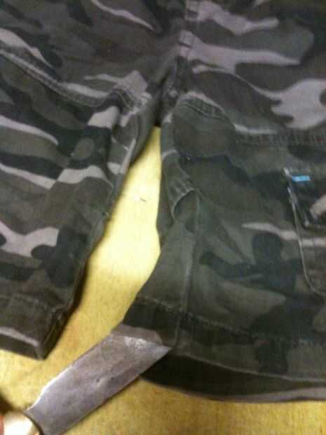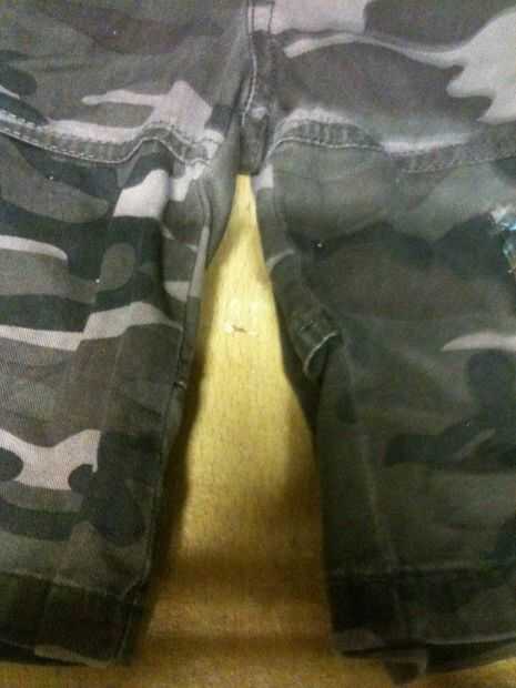 insumos necesarios: tijeras, lápiz, pantalones vaqueros de la tienda de segunda mano, paja, blanqueador, bedazzler, lavadora, espárragos, hierro-en remiendo y hierro.1) marcan los jeans a la longitud que desee cortar.2) cortar los jeans en donde se l
