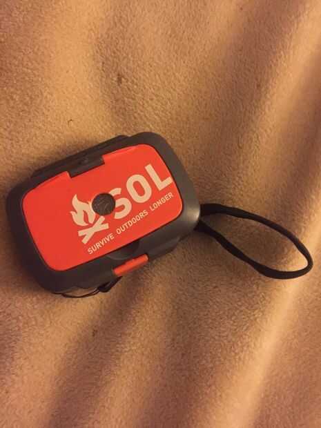 -Cuchillo, silbato, espejo de señal, brújula, percutor de sílex, linterna, cuerdas, Yesca del fuego, alambre trampa, imperdibles, espacio manta, kit de costura y artes de pesca