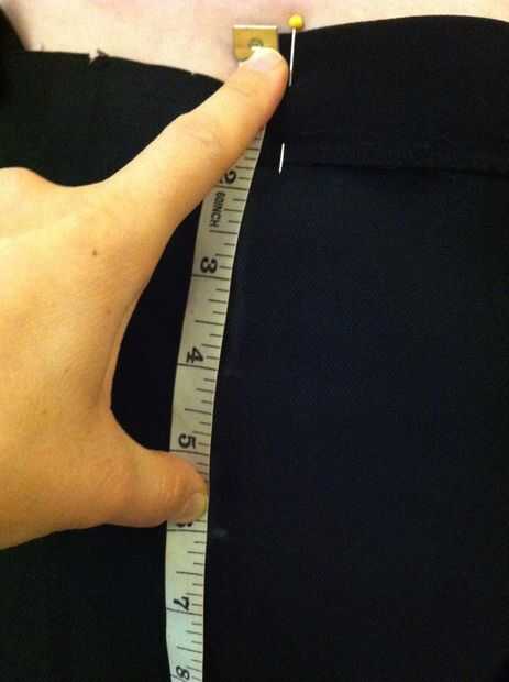 Después de liberar la parte superior de los pantalones de la banda de la cintura alrededor de sus marcas de panel frontal, tendrá que averiguar cómo altura desea su panel. Tomar el dispositivo de medición y alinéelo con las marcas realizadas anteriormente para la anchura del panel frontal. Medir hacia abajo desde la parte superior de la banda de la cintura, marcar la parte inferior de su panel frontal. Hice mis 6 pulgadas de alto. Repita al otro lado del tablero.