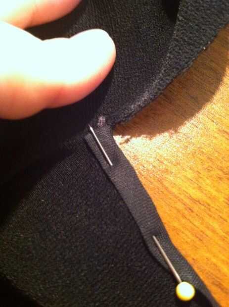 - PIN su cinta bies a la tela con la tela atiborrado tanto contra el pliegue de centro de la cinta como usted puede manejar (mi cinta era más fino que me hubiera gustado, pero lo tenía a la mano - recomiendo utilizar 1/4 de pulgada o más)