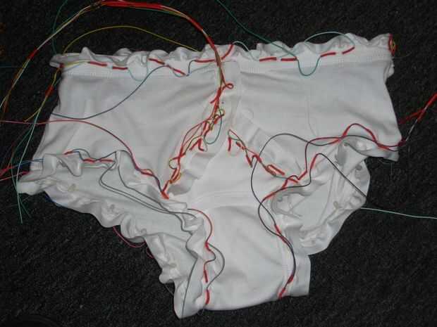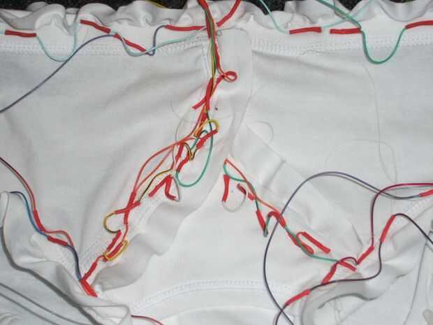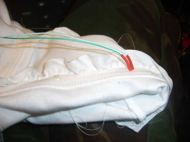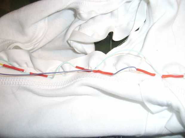 El Arduino fue cosido en su lugar en el lado exterior de los pantalones de lado y el clip de la batería de 9 voltios fue cosido en el otro lado.