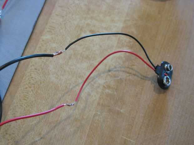 Por último, conectar el rojo y negro los cables al conector de presión de la batería de 9 voltios. Tira el aislante de los extremos de los cables de conector de resorte y los cables rojo y negro. Tenga en cuenta que los cables en el conector de presión pueden ser un calibre diferente, que tal vez necesite usar una porción diferente de los peladores para evitar cortar a través del cable.