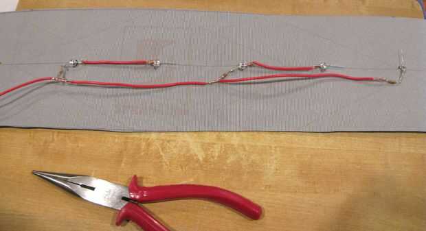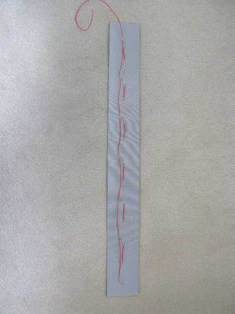 Consideré la parte paralela del circuito a ser la columna vertebral, así que empecé por cortar un alambre largo rojo para el lado positivo del circuito paralelo. Esto debe ser aproximadamente un pie más largo que la tira de vinilo para que pueda conectar a la batería y tener suficiente holgura para soltar la batería en la parte inferior del bolsillo delantero del pantalón.