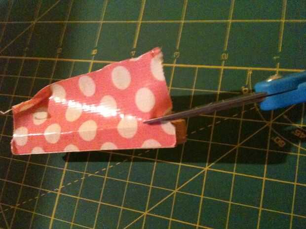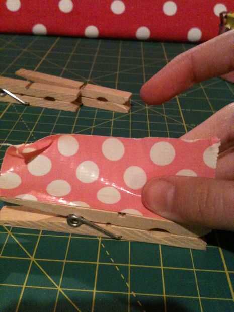 Rasgar un pedazo de cinta adhesiva sobre la longitud de la pinza para la ropa. Pegarlo a la parte superior de la pinza para la ropa, alineando cuidadosamente una parte para los bordes y esquinas. Pliegue la cinta a lo largo del otro lado y hacer un pequeño corte en el extremo del pliegue. Estafan al resto de la cinta a lo largo de la marca corte y doblar la cinta extra hacia los lados rápidamente.