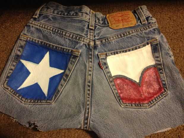 insumos necesarios: tijeras, lápiz, pantalones vaqueros de la tienda de segunda mano, paja, blanqueador, bedazzler, lavadora, espárragos, hierro-en remiendo y hierro.1) marcan los jeans a la longitud que desee cortar.2) cortar los jeans en donde se l